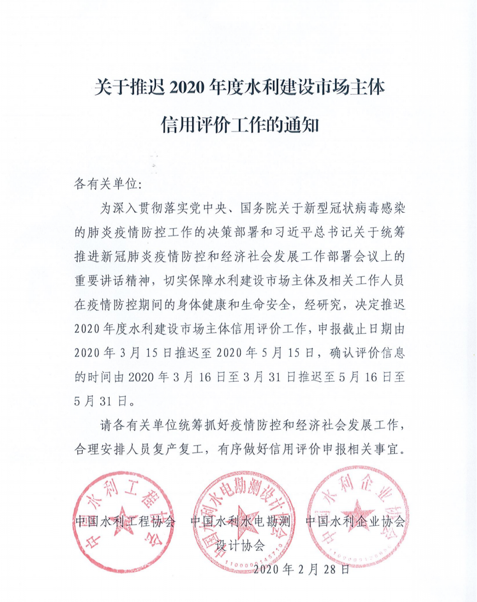 關(guān)于推遲2020年度水利建設(shè)市場主體信用評價工作的通知