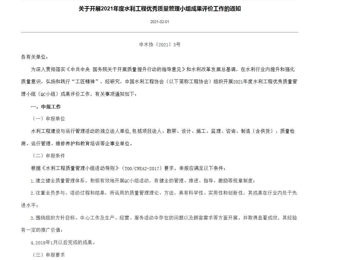 關(guān)于開展2021年度水利工程優(yōu)秀質(zhì)量管理小組成果評價工作的通知