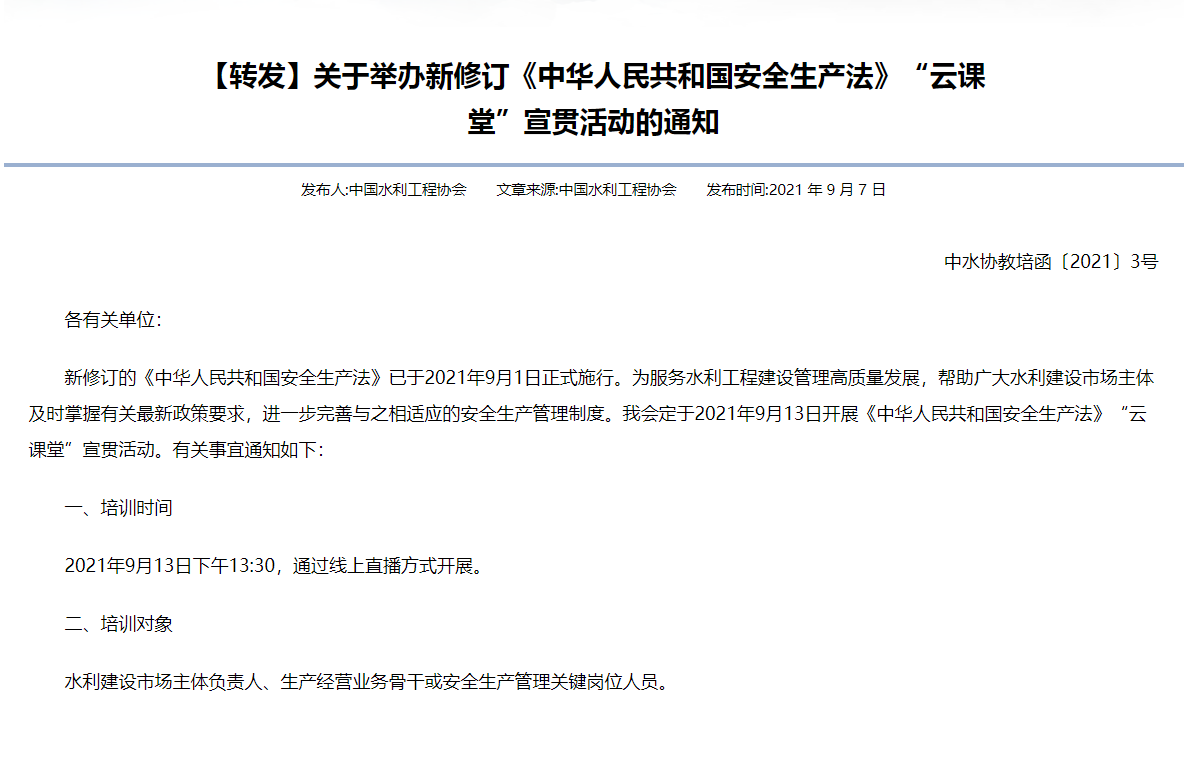 關(guān)于舉辦新修訂《中華人民共和國(guó)安全生產(chǎn)法》“云課 堂”宣貫活動(dòng)的通知